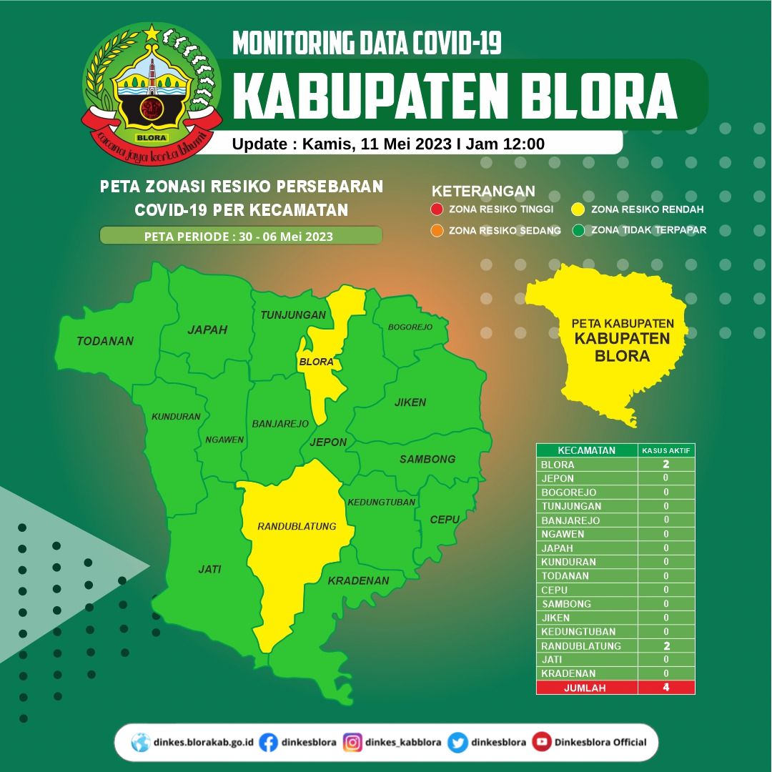 Kendati demikian, zonasi penyebaran COVID-19 di 16 Kecamatan di wilayah Kabupaten Blora sudah tergolong aman dan ringan. (RLS)
