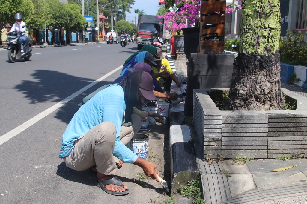 Pengecatan ulang kanstin trotoar di jalan Pemuda karena sudah terlihat kusam supaya kembali terlihat bersih dan indah.